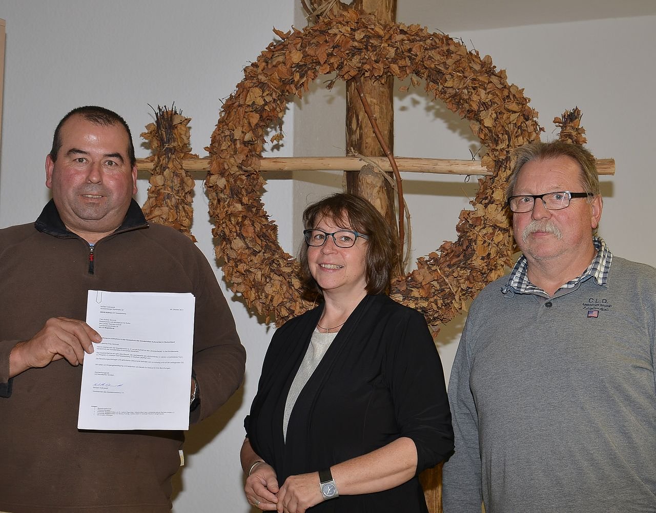 Christiane Funkel, Leiterin der Verwaltung des Biosphärenreservats Karstlandschaft Südharz, unterstützte den Vorsitzenden des Questenvereins Norbert Volknandt (links) und den Ortsbürgermeister von Questenberg Gerald Schumann bei der Beantragung zur Aufnahme des Questenfestes in das Bundesweite Verzeichnis des Immateriellen Kulturerbes. Foto: Heinz Noack