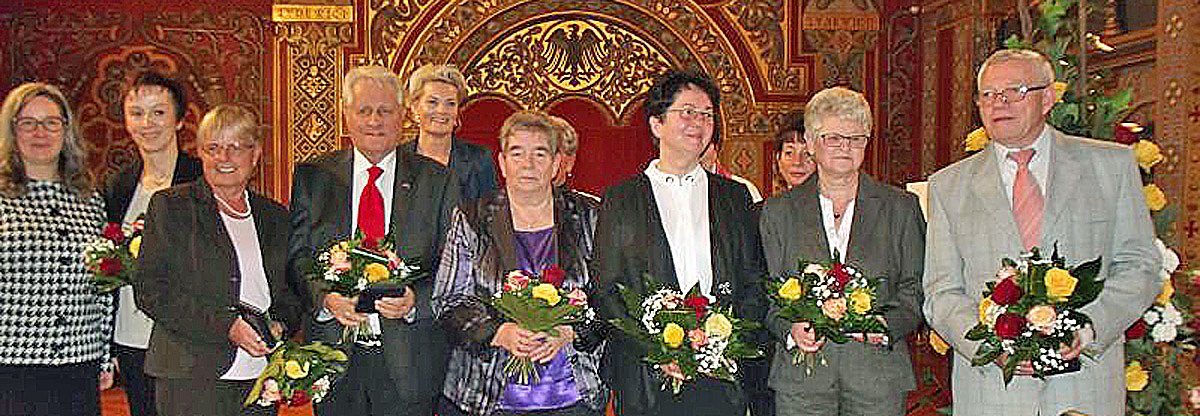 Hier Christa Groß bei Ihrer Auszeichnung mit Ministerin Heike Werner, Landrätin Antje Hochwind und Bürgermeister Joachim Kreyer