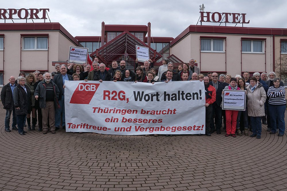Die Aufforderung "r2g, Wort halten" bezieht sich auf den Koalitionsvertrag, worin sich die drei Parteien unter anderem verpflichtet haben, dafür zu sorgen, dass Thüringen "Vorbildland für Gute Arbeit" werden soll und das "Tarifbindung ausgebaut und betriebliche Mitbestimmung gestärkt (wird)". Auch bekannten sich die Parteien zu einem "echten Tariftreue- und Vergabegesetz", wozu sie das aktuelle Thüringer Vergabegesetz weiterentwickeln wollten.