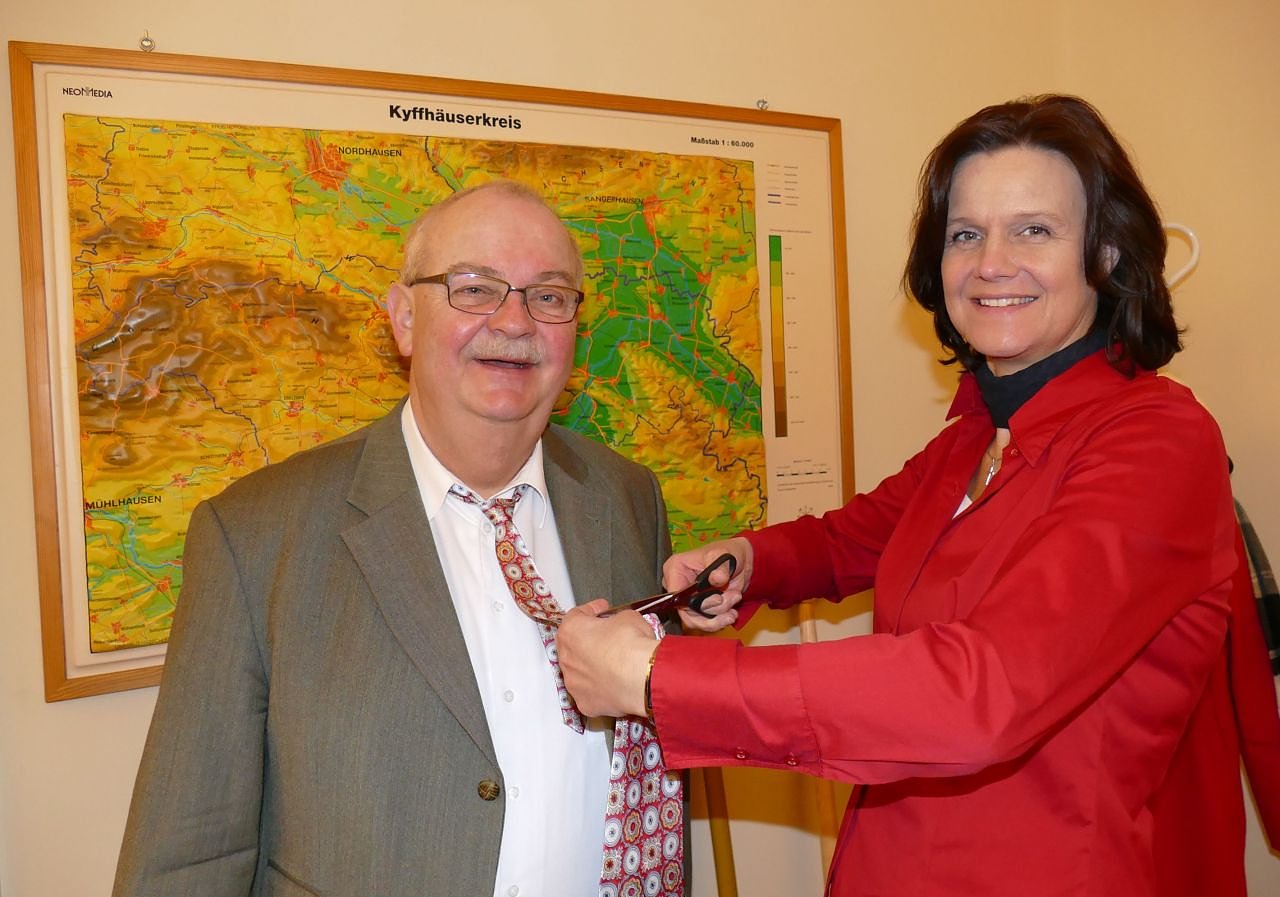 Zum Weiberfasching muste auch der Schlips von Verwaltungsleiter Dr. Heinz-Ulrich Thiele dran glauben. Zum Weiberfasching passend war es Landrätin Antje Hochwind höchst persönlich, die es vollzog.