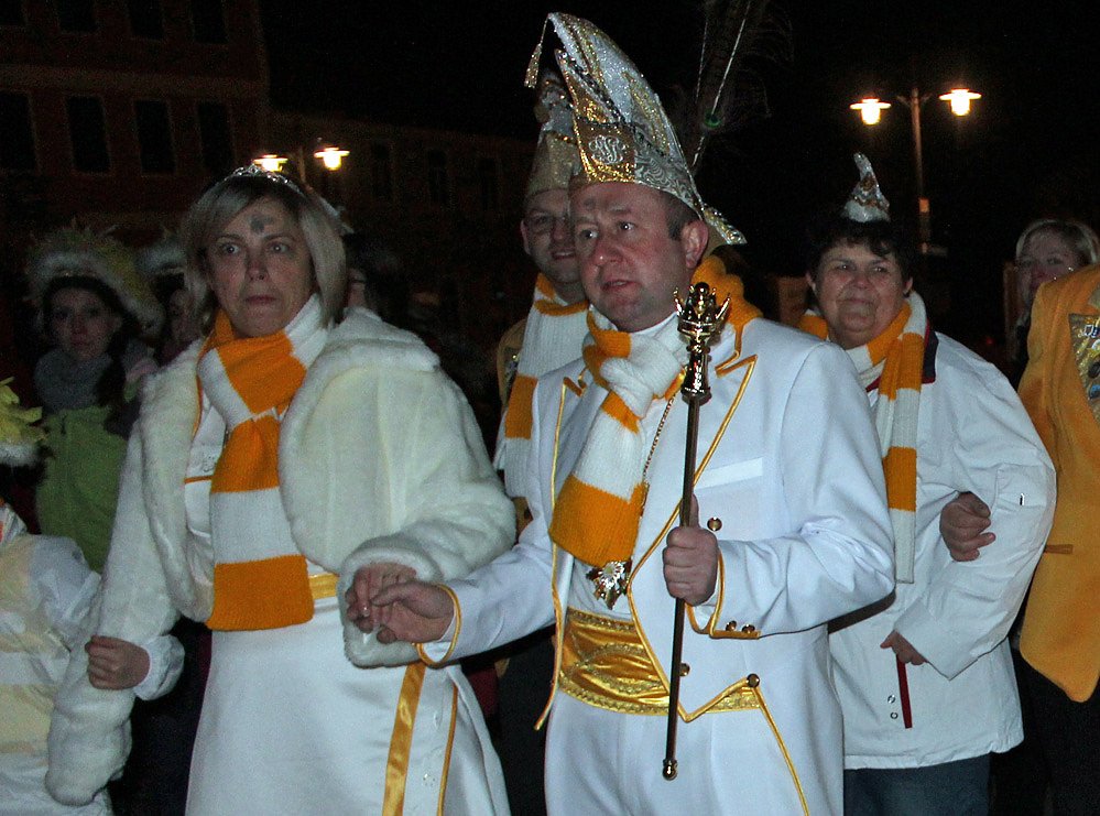 Im dunklen Schein der Laternen kurz nach 19:00 Uhr erkannte kn Vertreter der Karnevalsvereine Blau-Weiß, Gelb-Weiß und Grün-Weiß.