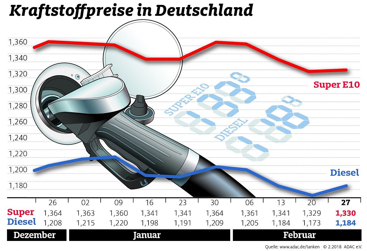 Auskunft über die aktuellen Spritpreise an den deutschen Tankstellen bietet die Smartphone-App ADAC Spritpreise. Ausführliche Informationen gibt es zudem unter www.adac.de/tanken.