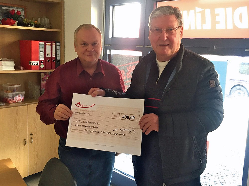 Die Abgeordneten der Fraktion DIE LINKE. im Thüringer Landtag haben es sich zur Aufgabe gemacht, einen Teil ihrer Diätenerhöhung zu spenden. Dazu hat die Fraktion den Verein Alternative 54 e.V. gegründet. Der Name steht für den Artikel 54 in der Thüringer Verfassung, in dem die Diätenerhöhung der Abgeordneten geregelt ist. Der Verein spendet das Geld an gemeinnützige Vereine und Verbände - in der Summe bisher über eine Million Euro. Ein Teil davon kommt nun dem Kleingartenverein Tongebreite zu Gute.