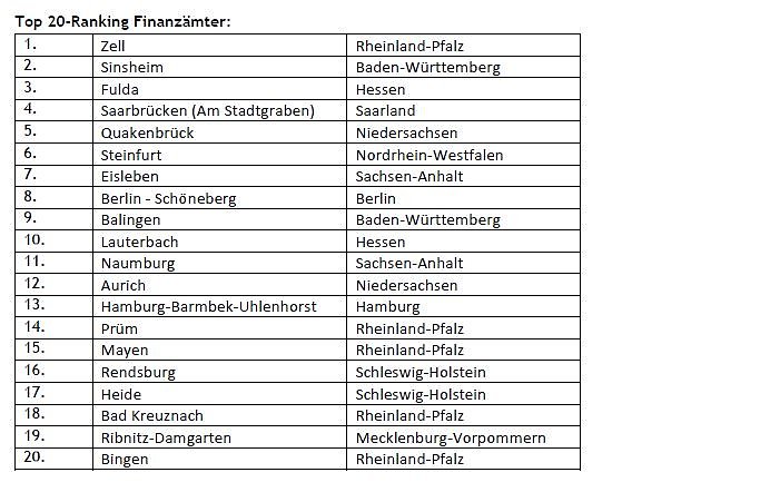 Die mehr als 10.000 Teilnehmer des letztjährigen Votings bewerteten das für Sie zuständige Finanzamt in den drei Kategorien Freundlichkeit der Finanzamtsmitarbeiter, Geschwindigkeit der Bearbeitung der Steuererklärung sowie Erreichbarkeit bei Fragen auf einer Skala von ein bis fünf Punkten. Das Finanzamt Zell (Mosel) erreicht mit durchschnittlich 4,97 Punkten den bundesweiten Spitzenwert, den besten Bundeslandschnitt erzielt Hamburg mit 4,33 Punkten. Berlin verbessert sich im Vergleich zum Vorjahr deutlich und macht einen Sprung von Rang sieben auf Platz zwei. Rheinland-Pfalz setzt seine Tradition guter Platzierungen bei der Wahl zum kundenfreundlichsten Finanzamt fort und landet auf dem dritten Rang.