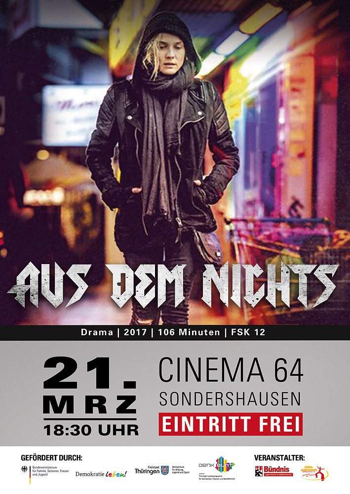 Anlässlich des Internationalen Tag´ gegen Rassismus zeigen das Bündnis gegen Rechts im Kyffhäuserkreis und der Kreisjugendring Kyffhäuserkreis e.V. am Mittwoch, 21.03.2018, 18:30 Uhr im Cinema64 in Sondershausen den Film: Aus dem Nichts.