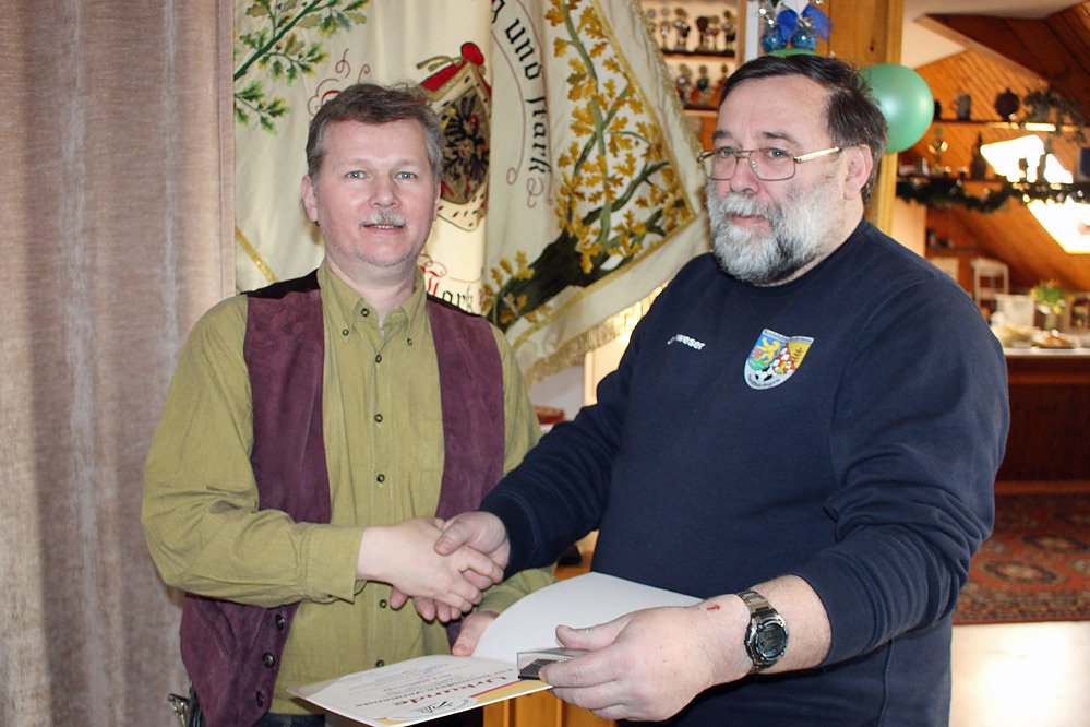 Autor: khhGefeiert wurde im Schützenhaus des Schützenvereins "1908 Wiedermuth", denn neben dem Fußball zählt auch der Schießsport zu einer Leidenschaft von Jörg Steinmetz. Im Rahmen der Feier überreichte der KFA-Vorsitzende Jürgen Schweser die Ehrenadel des Kyffhäuser-Kreissportbundes.