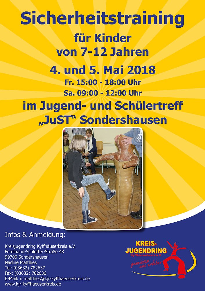 Dabei geht es sowohl um fremde Menschen als auch um alltägliche Schulsituationen. Mit einfachen Griffen werden die Kinder durch den professionellen Trainer, Herrn Andreas Kolleck, mit verschiedenen Techniken vertraut gemacht. Am Freitag, dem 04.05.2018, wird der erste Teil des Trainings von 15:00 bis 18:00 Uhr durchgeführt. Der zweite und auf den ersten aufbauende Teil findet am Samstag, den 05.05.2017, von 09:00-12:00 Uhr statt. Die Teilnahmegebühr beträgt 25,00 €.
