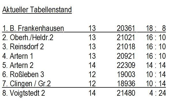Mit der Partie 1.KC Artern 2 – BW Voigtstedt wurde bereits der letzte Spieltag begonnen. Am Ende siegten die Salinestädter knapp mit 1507 : 1497 Holz. Die Einzelbesten waren die beiden Kapitäne Karl- Heinz Hundt (407) und Falco Sohr (391).