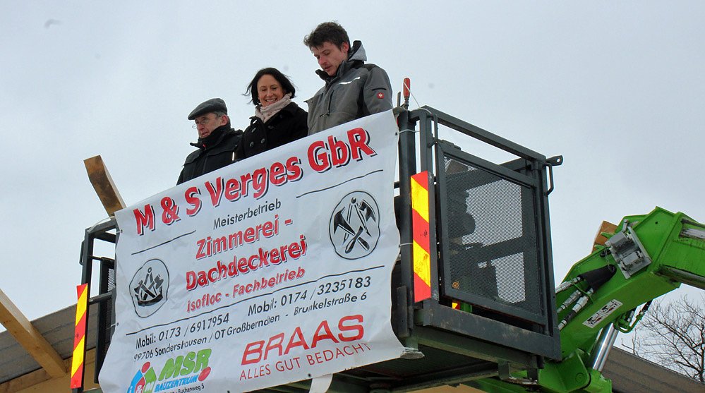 Martin Verges sprach den Richtspruch und Stefan Verges bediente die Hebebühne. Nach dem Einschlagen des Nagels gab es einen Schnaps auf das gute Gelingen des Baus.