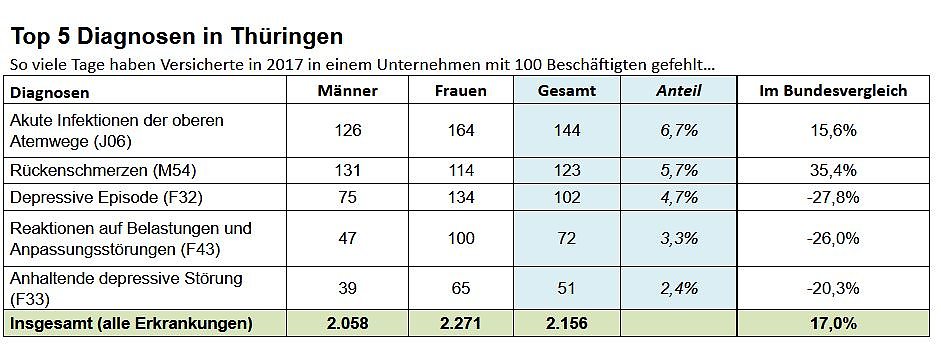 Die demografische Entwicklung hinterlasse ihre Spuren in Mitarbeiterstruktur und Krankenstatistik. Bemerkenswert ist, dass die absolute Zahl der Krankschreibungen zwar relativ stabil ist, doch die Fehldauer immer länger wird. Im Schnitt dauerte eine Krankschreibung in Thüringen 14,2 Tage. Unter den Hauptdiagnosen stehen Atemwegs- und Rückenerkrankungen, die allein über 12 Prozent aller Fehltage ausmachen (siehe Tabelle). Doch für die langen Fehlzeiten sind vor allem psychische Diagnosen verantwortlich, darunter Depressive Episoden, anhaltende Depressionen und Belastungsstörungen.