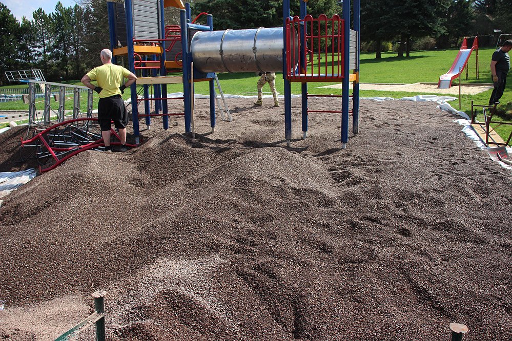 Und da wurden ganz schöne Masse bewegt. Damit das Klettergerüst überhaupt aufgestellt werden durfte, musste Rundkies mit einer bestimmten Körnung verwendet werden und nicht zu knapp. Wie Vereinsvorsitzender Detlef Wiegel im Gespräch mit kn erläuterte, mussten dazu 110 Tonnen Kies aufgeschüttet werden! Zum Glück hatte man technische Hilfe.