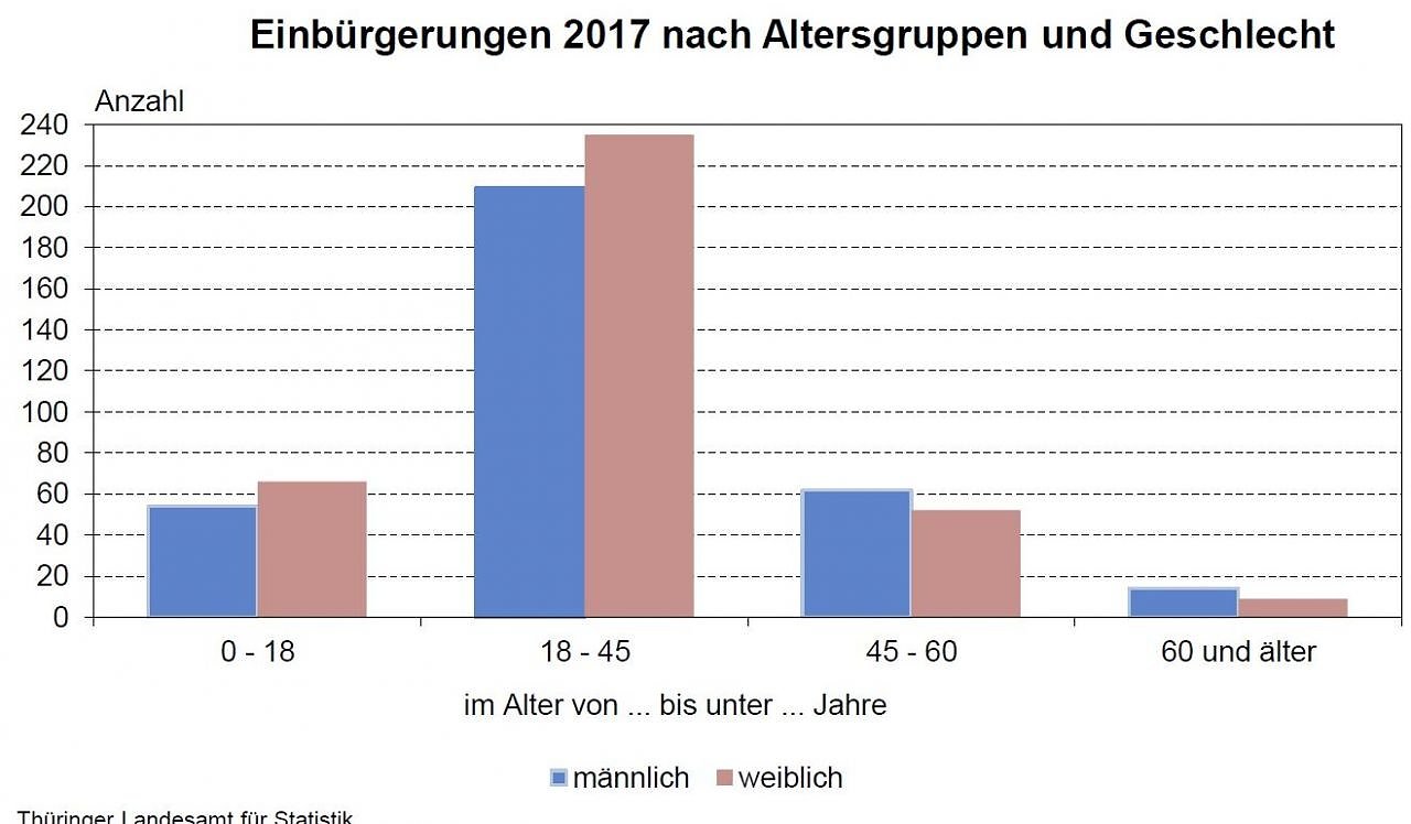 Im Verlauf des Jahres 2017 haben in Thüringen 701 ausländische Personen (339 Männer und 362 Frauen) durch Einbürgerung die deutsche Staatsangehörigkeit erlangt. Dies ist nach Mitteilung des Thüringer Landesamtes für Statistik der höchste Wert seit dem Jahr 2000. Gegenüber dem Vorjahr stieg die Zahl der eingebürgerten Personen deutlich um rund 17 Prozent (100 Personen)...