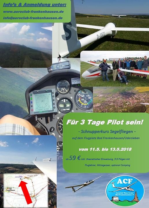 Wo muss man sich anmelden? Die Anmeldung erfolgt über info@aeroclub-frankenhausen.de und weitere Informationen gibt es über www.aeroclub-frankenhausen.de oder an den Wochenenden direkt am Flugplatz Bad Frankenhausen-Udersleben.