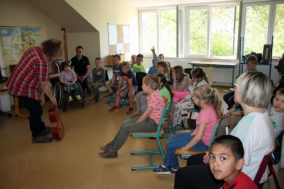 Kein geringerer als Gitarren-Virtuose Klaus-Dieter Weigert stellte heute den Schülerinnen und Schüler der ersten Klassen Musikinstrumente vor, ob Konzertgitarre oder E-Gitarre.
