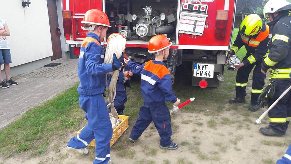 Danach ging es auch schon los mit der ersten Vorführung. 12 Kinder der Jugendfeuerwehr Westgreußen/Wasserthaleben zeigten bei einem simulierten Brand ihr Können. Eine verletzte Person wurde behandelt und von der Einsatzstelle verbracht. Zeitgleich kam auch schon das Kommando Wasser marsch. Schläuche wurden ausgerollt und unter den Augen der sichtbar stolzen Eltern und Großeltern der Brand mit 2 Strahlrohren bekämpft.