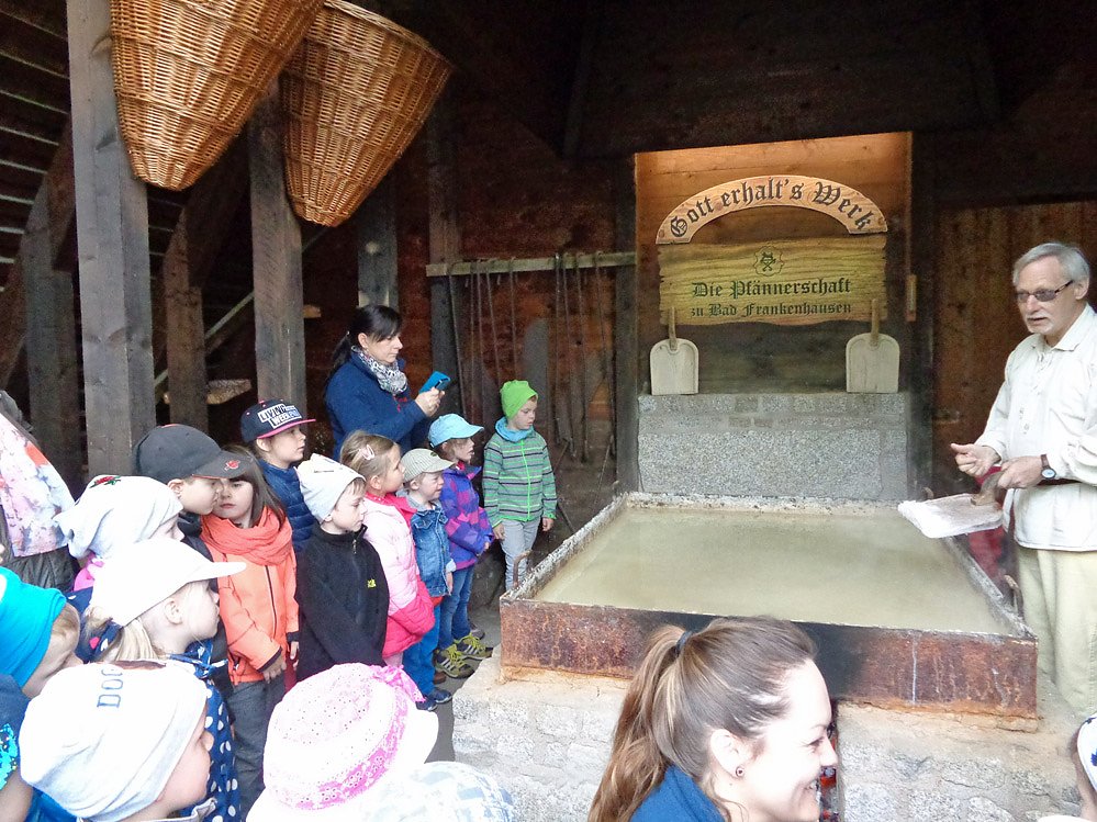 Dann ging es mit dem Salzhund Mutz in der Kurstadt auf Spurensuche. Die Kinder erkundeten typischen Sehenswürdigkeiten von Bad Frankenhausen. Dabei konnte vom Solewasser der Elisabeth- Quelle gekostet, den Salzsiedern über die Schulter geschaut oder im Gradierwerk bzw. in der Salzgrotte inhaliert werden.