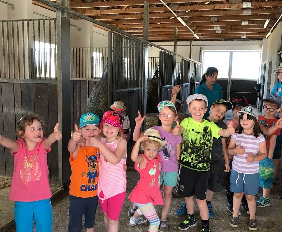 Die Stute äppelte erst einmal fleißig – zur Erheiterung der Kinder. Danach wurde Schnappi gesattelt und auf den Außenreitplatz geführt. Hier durften Alle einmal aufsitzen und fühlen, wie gut es sich bei den ruhigen Bewegungen des Pferdes auf seinem Rücken sitzen lässt. Auch hier waren alle Kinder der Gruppe ganz mutig. In unmittelbarer Nähe der Pferde waren die Kinder sehr ruhig und diszipliniert. Doch nun ging es auf eine große Wiese zum Toben, Heuballen erklimmen, Hufeisen werfen und anderen Wettbewerben.