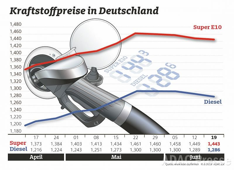 Bei den Kraftstoffpreisen setzt sich die leichte Entspannung der vergangenen Wochen fort. Gegenüber der Vorwoche sank der Preis für einen Liter Super E10 nach Angaben des ADAC um 0,6 Cent auf durchschnittlich 1,443 Euro. Für einen Liter Diesel mussten Autofahrer mit 1,286 Euro pro Liter im Schnitt 0,3 Cent weniger bezahlen...