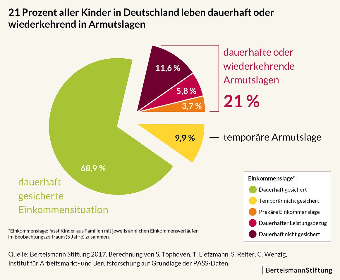Die Studie ist Teil des Projektes Lebensumstände von Kindern im unteren Einkommensbereich des IAB im Auftrag der Bertelsmann Stiftung. Datengrundlage ist die repräsentative Längsschnittstudie Panel Arbeitsmarkt und Soziale Sicherung (PASS), in dem seit 2006 jährlich ca. 15.000 Personen ab 15 Jahren befragt wurden. Für die vorliegende Studie konnten für 3.180 Kinder Informationen über einen Zeitraum von fünf Jahren ausgewertet werden.Zu jedem der fünf Beobachtungszeitpunkte wird die Einkommenssituation für den Haushalt des jeweiligen Kindes betrachtet, so dass während des Zeitraums Wechsel in und aus Armut sowie die Dauer von Armutsepisoden beobachtet werden können. Je nach Dauer und Wechsel von Armutslagen wird zwischen temporären, wiederkehrenden oder dauerhaften Armutslagen bzw. gesicherten Einkommenslagen unterschieden.