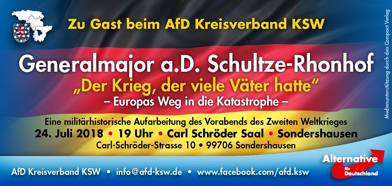 Generalmajor a.D Gerd Schultze-Rhonhof wird in seinem Vortrag Thesen, Indizien und Fakten aufgreifen, die uns einen ganz neuen Blick auf die Vorgeschichte des Zweiten Weltkrieges geben werden und damit zum Denken anstiften. Der Vortrag basiert auf seinem bekannten Buch Der Krieg der viele Väter hatte. Europas Weg in die Katastrophe, welches mittlerweile in der 9. Auflage erschienen ist.