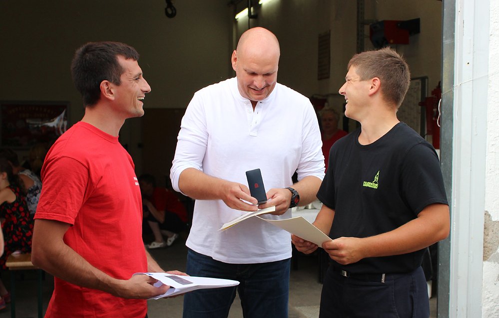 Sondershausens Bürgermeister Steffen Grimm (mitte) nahm zusammen mit Wehrführer Marcus Weise (li.) zwei Auszeichnungen vor. Hier erhielt Martin Bühling das bronzene Brandschutzabzeichen am Bande für 10 Jahre Mitgliedschaft in der Freiwilligen Feuerwehr. Die gleich Ehrung erhielt in Abwesenheit Kamerad Tobias Schmidt.
