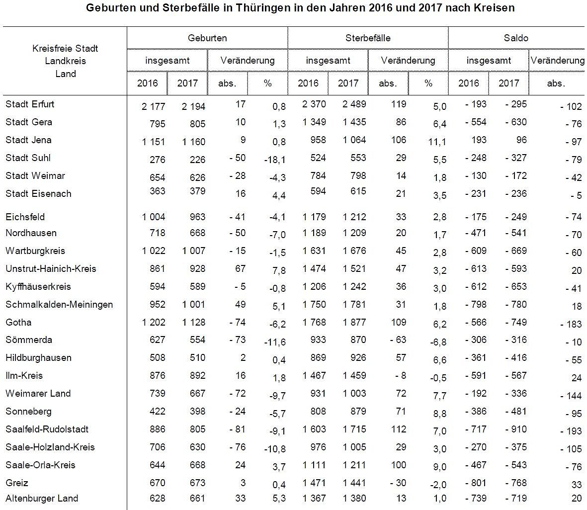 Jena konnte 2017 als einzige Stadt einen Geburtenüberschuss aufweisen. In der Stadt an der Saale wurden 96 Kinder mehr geboren als Personen gestorben sind. In allen anderen kreisfreien Städten und Landkreisen starben hingegen mehr Personen, als gleichzeitig Kinder geboren wurden. Den geringsten negativen Saldo wiesen darüber hinaus die Stadt Weimar (-172 Personen), die Stadt Eisenach (-236 Personen) sowie die Stadt Erfurt (-295 Personen) auf.
