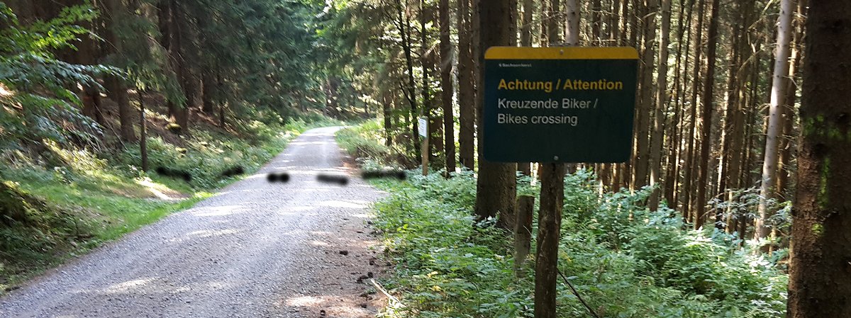 Da kreuzen sogar richtige Bikerwege die Wanderwege. Und die Warnung erfolgt durch SachsenForst.