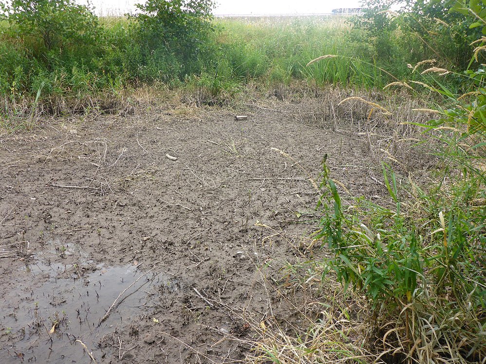 Im Frühsommer dieses niederschlagarmen Jahres musste die Projektleiterin Frau Patzelt vom LPV feststellen, dass eine der drei Laichgewässer trockengefallen ist. Nur wenige Tage zuvor konnten hier Fische beobachtet werden, doch fallende Wasserstände in der Kleinen Helme schnitten die Flachwasserzone vom Gewässer ab. So musste kurzfristig gehandelt werden! Mit dem Spaten haben die Mitarbeiterinnen des Landschaftspflegeverbandes Frau Bier und Frau Patzelt den schmalen Zulauf zur Laichtasche vertieft und so die Anbindung zur Kleinen Helme wiederhergestellt.