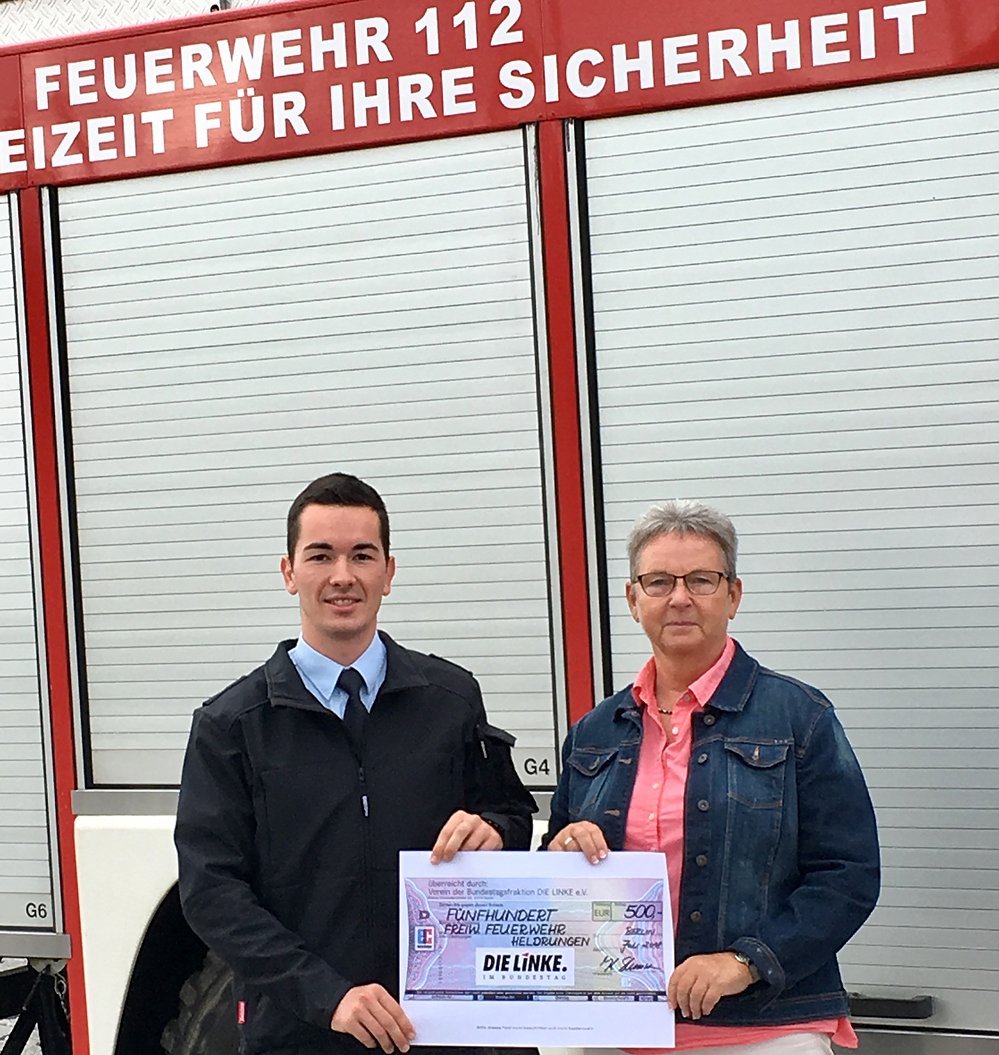 Im Gepäck hatte Sie einen Scheck für die Anschaffung von einheitlicher Dienstbekleidung, welchen Sie dem Stadtbrandmeister überreichte. Eine Unterstützung des Verein der Bundestagsfraktion DIE LINKE e.V.