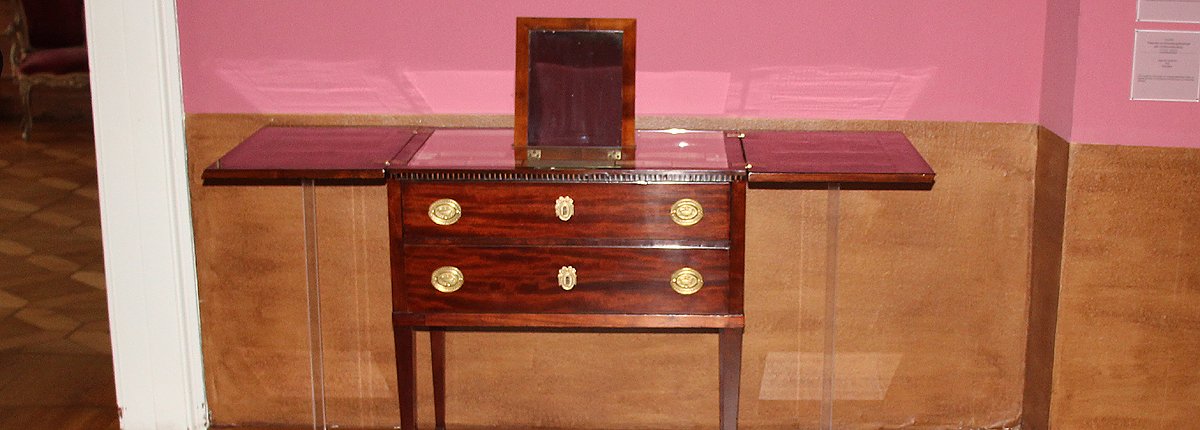 des Schwarzburger Fürstenhauses in Sondershausen überliefert. Vermutlich war das Toilettentischchen in der privaten Nutzung der Fürstin Caroline (Gemahlin von Günther Friedrich Carl I. von Schwarzburg- Sondershausen). Neben seiner Ästhetik beeindruckt die Wandelbarkeit des Tischchens, das als Beispiei für ein "Multifunktionsmöbel aus der Werkstatt Hoffmann gelten kann (Schreibtisch, Frisiertisch, Nachttisch).
