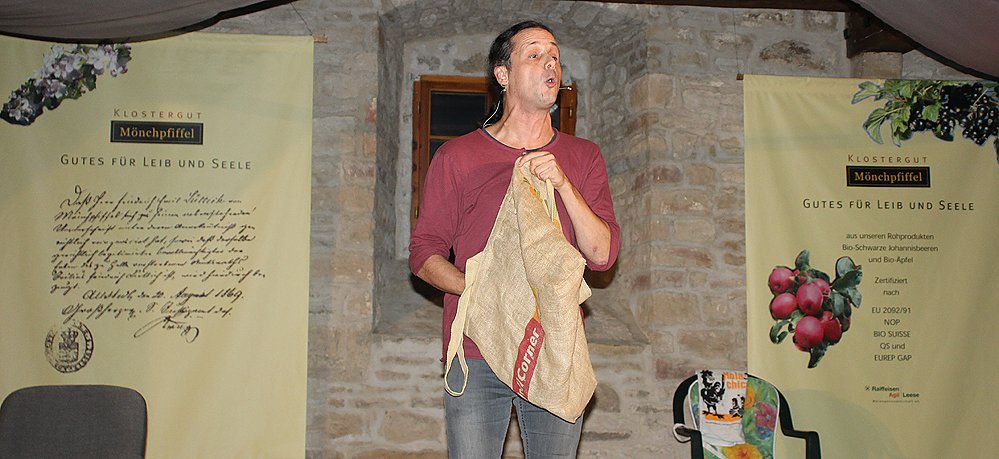 Philipp Weber bot einen sehr vergnüglichen Abend rund ums Essen. Er nahm nicht nur die Essgewohnheiten der Leute aufs Korn, sondern auch und besonders die Indstrie und die vielen Gesundheitsberatr, die uns Bürgern weis machen wollen was gesund ist. Oder haben Sie schon mal etwas von dem cholesterinfreien Wasser gehört, dass in Amerika verkauft wird?
