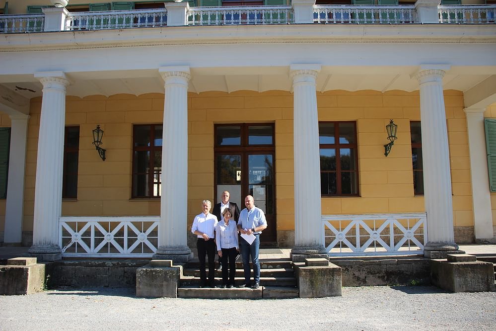 Intendant Daniel Klajner, Leiterin des Schlossmuseum Christa Hirschler, Sondershausens Bürgermeister Steffen Grimm und oben Schlossverwalter Manuel Mucha.