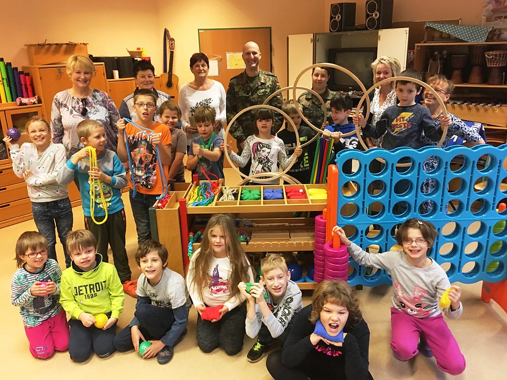 Die Schüler bedankten sich mit den Liedern Hallo schön, dass du da bist und Kommt wir wollen uns bewegen. Hier wurde nicht nur gesungen, sondern auch die Texte durch rhythmische Bewegungen begleitet. Natürlich nahmen dabei die Schüler Frau Girschele und Herrn Oberstleutnant Podolski in ihre Mitte.