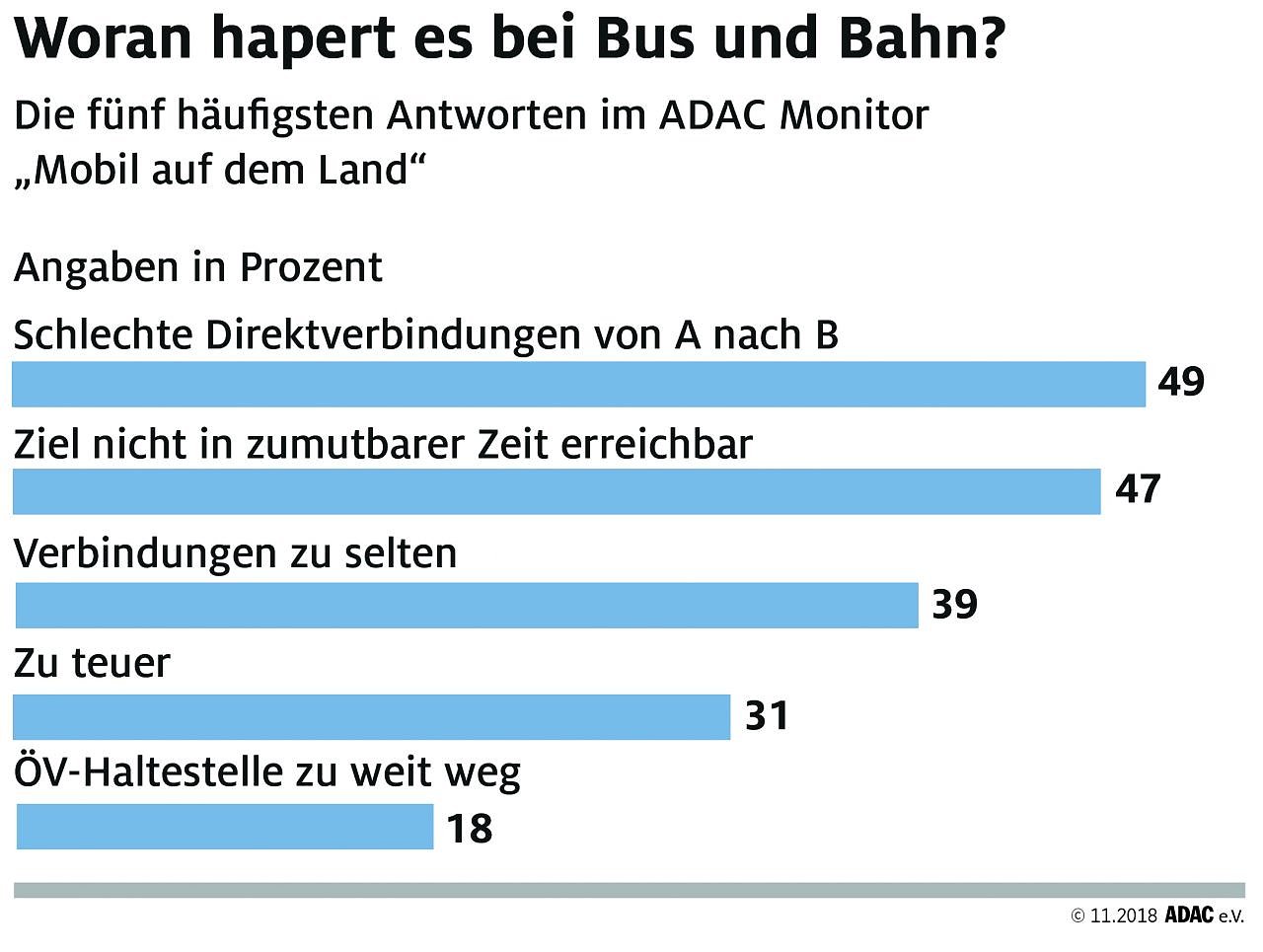 So schneiden Bus und Bahn in den alten Bundesländern deutlich schlechter ab als in Ostdeutschland. Die zufriedensten ÖV-Nutzer finden sich laut ADAC Untersuchung in Sachsen-Anhalt, dagegen landen Schleswig-Holstein und Rheinland-Pfalz auf den hinteren Plätzen. Gründe für das schlechte Abschneiden des ÖV sind fehlende Direktverbindungen, unzureichende Taktung und die als zu lang empfundene Fahrdauer.