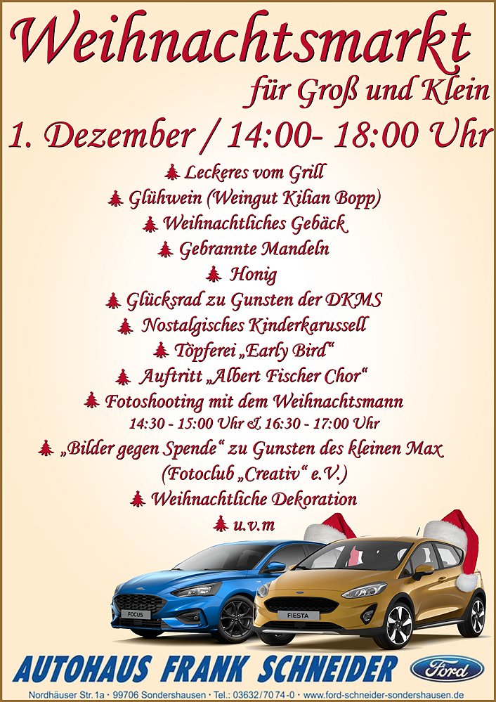 Das Team vom Ford Autohaus Frank Schneider in der Nordhäuser Straße in Sondershausen lädt am Samstag zum zweiten Weihnachtsmarkt ein. Die Erlöse vom Weihnachtsmarkt zum Teil für die DKMS und für den an Leukämie erkrankten Max aus Großfurra gespendet...