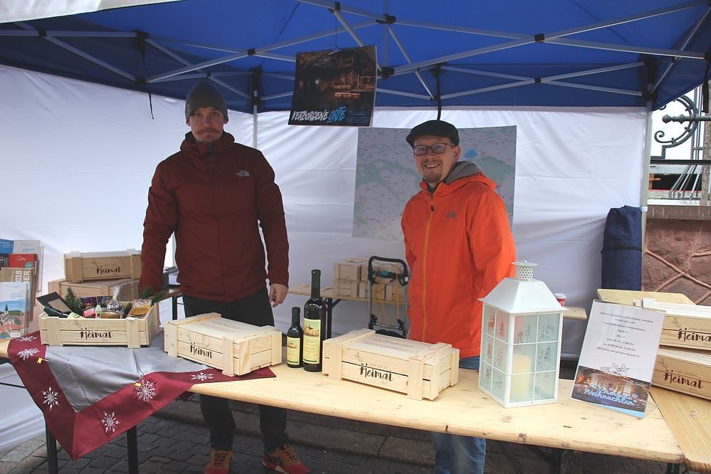 Marcus Strunck und Alexander Strien vom Stadtmarketing Sondershausen boten Informationen und heimische Produkte in der Geschenkebox an.