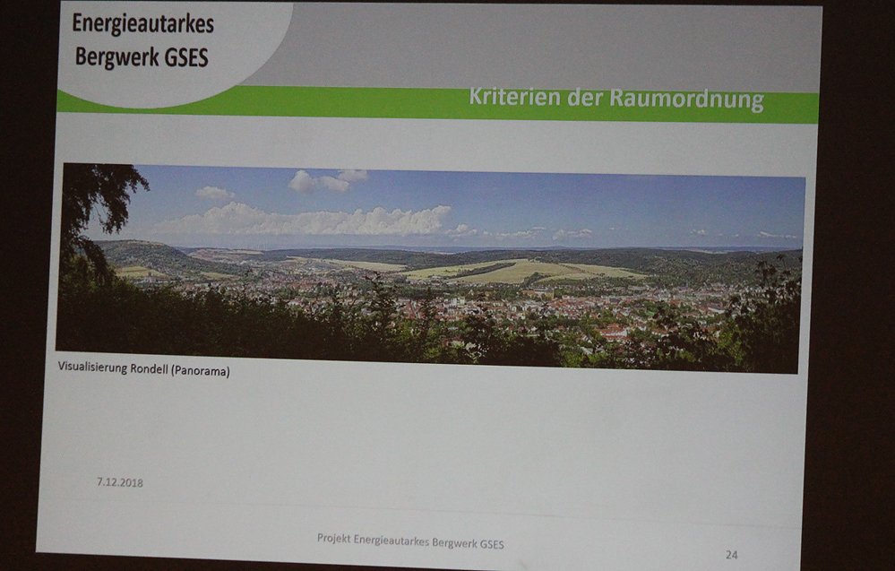 Mit diesem Bild sollte gezeigt werden, dass die drei Windräder, aus Sicht Stadt, das Panorama nicht wesentlich beeinträchtigen werden. Wie hoch die Windräder werden sollen, wurde nicht gesagt.