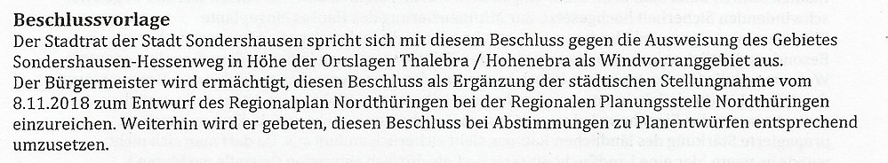 Autor: khhAntrag der Fraktionen Volkssolidarität / DIE LINKE. - Votum gegen die Ausweisung des Gebietes Sondershausen-Hessenweg in Höhe der Ortslagen Thalebra / Hohenebra als Windvorranggebiet
