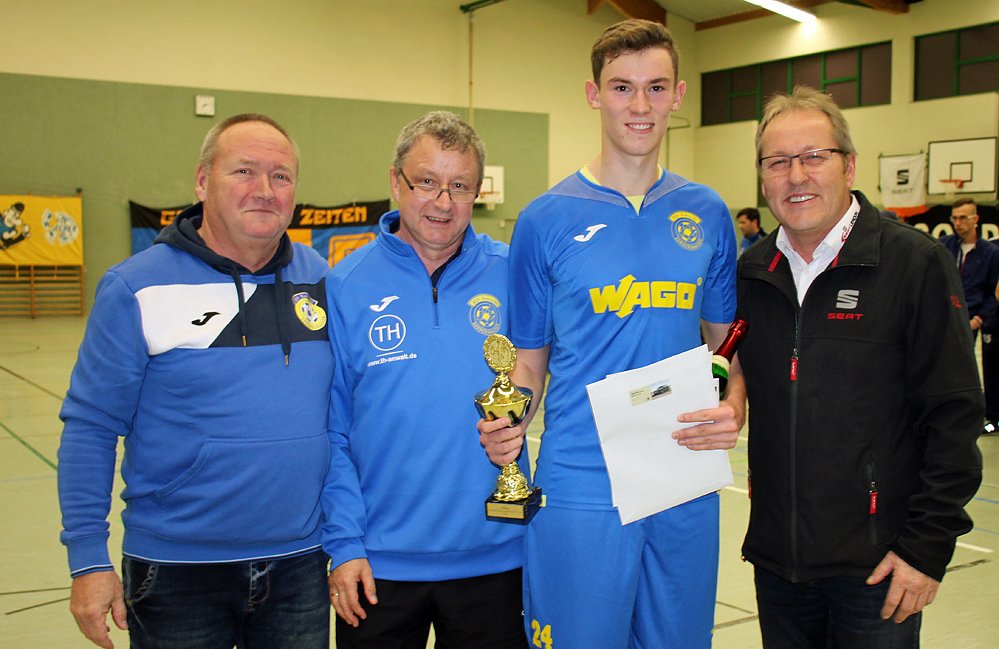 Jannis Zimmermann eigentlich Verteidiger hatte mit sechst Treffern die Torschützenkanone knapp verpasst (sechs Treffer) und nahm hier die Siegerurkunde und den Pokals entgegen. Die Siegerehrungen nahm Veit Lerdon vor.