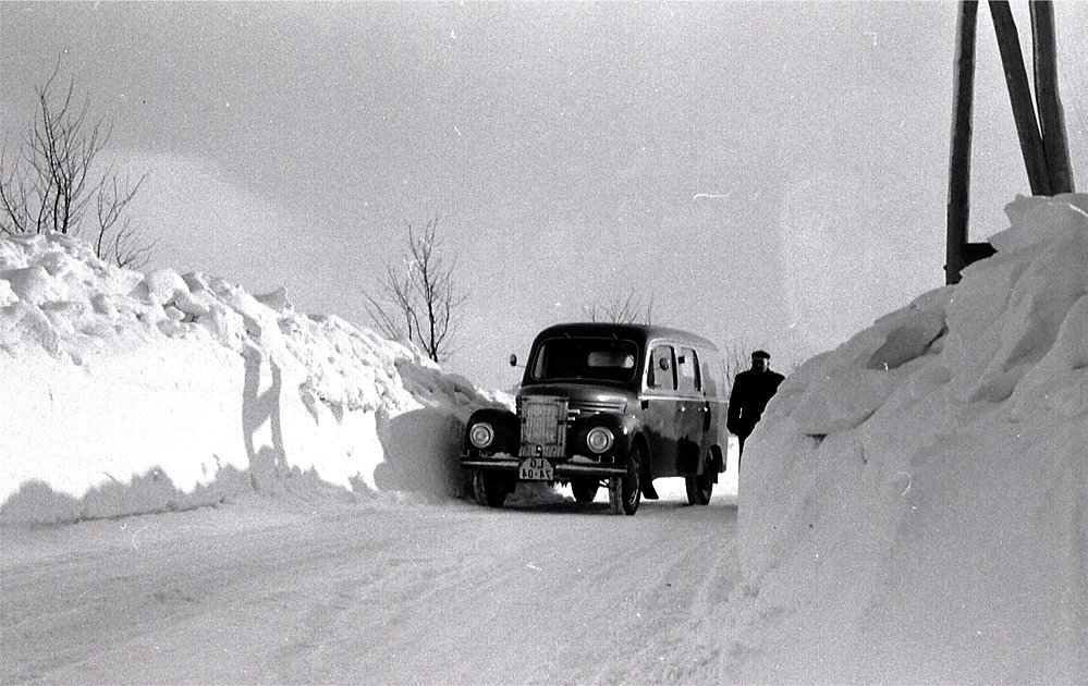 Mit einem Framo Transporter versuchte Günter Herting, damals Angestellter der Konsumgenossenschaft, durch meterhohe Schneewehen den Weg nach Schernberg zu schaffen, um die dringend benötigten Nahrungsmittel anzuliefern.