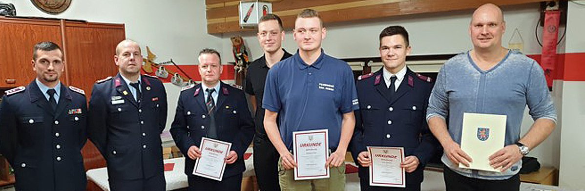Ebenfalls wurden an diesem Abend wieder Beförderungen und Ehrungen vorgenommen. So bekam Tino Pfeil für 10 Jahre das bronzene Brandschutzabzeichen am Bande verliehen. Sebastian Trost, Justin Diekneite wurden zum Oberfeuerwehrmann, Michael Hellmich zum Oberlöschmeister und Christian Kaufmann zum Hauptfeuerwehrmann befördert.