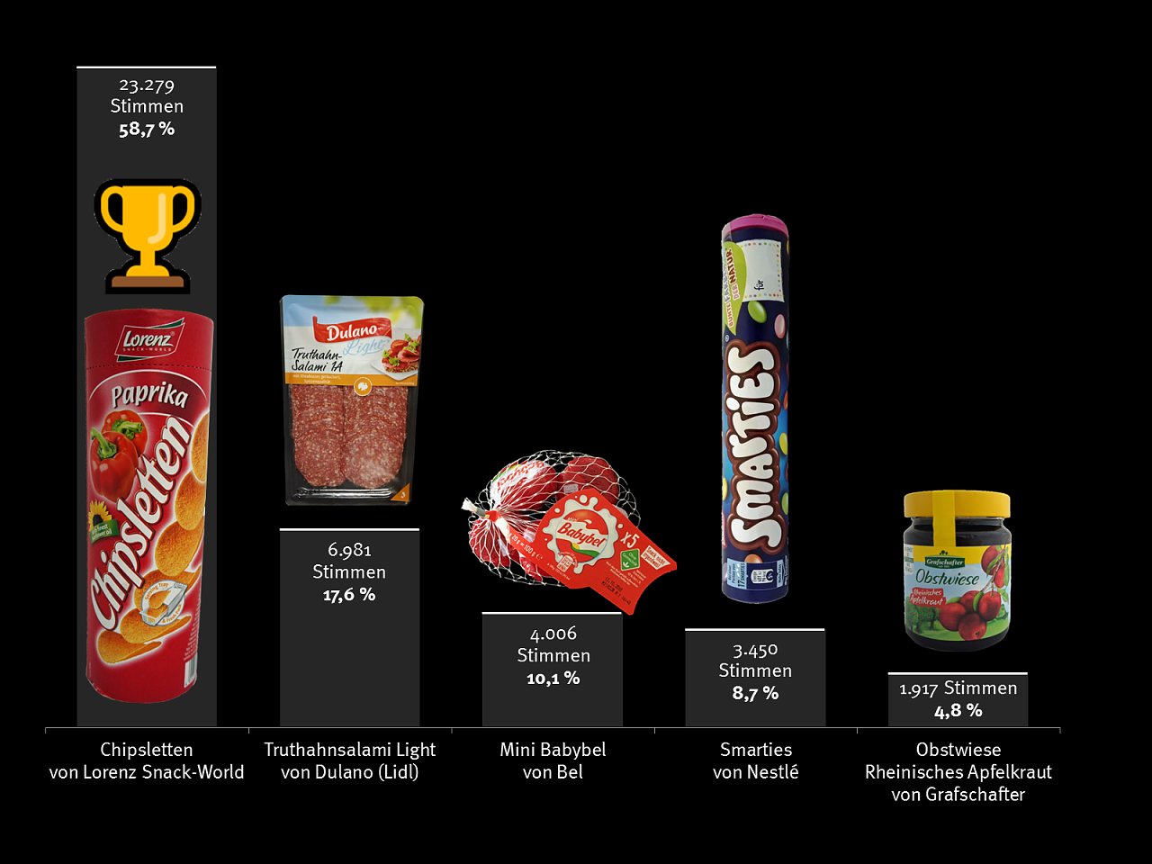 Neben den Chipsletten standen vier weitere Produkte als "Mogelpackung des Jahres 2018" zur Wahl. 39.633 Verbraucher beteiligten sich an der fünften Online-Abstimmung zu Mogelpackungen.