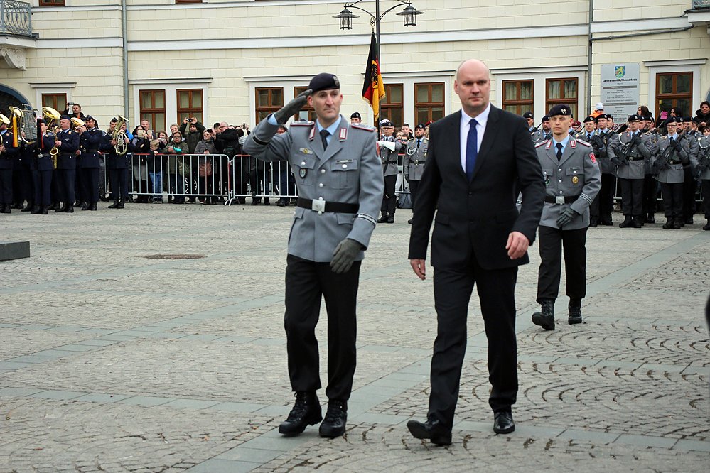 Zur Begrüßung der angetretenen Einheiten schritten Bürgermeister Steffen Grimm und der Kommandeur Oberstleutnant Stephan Podolski die Einheiten ab.