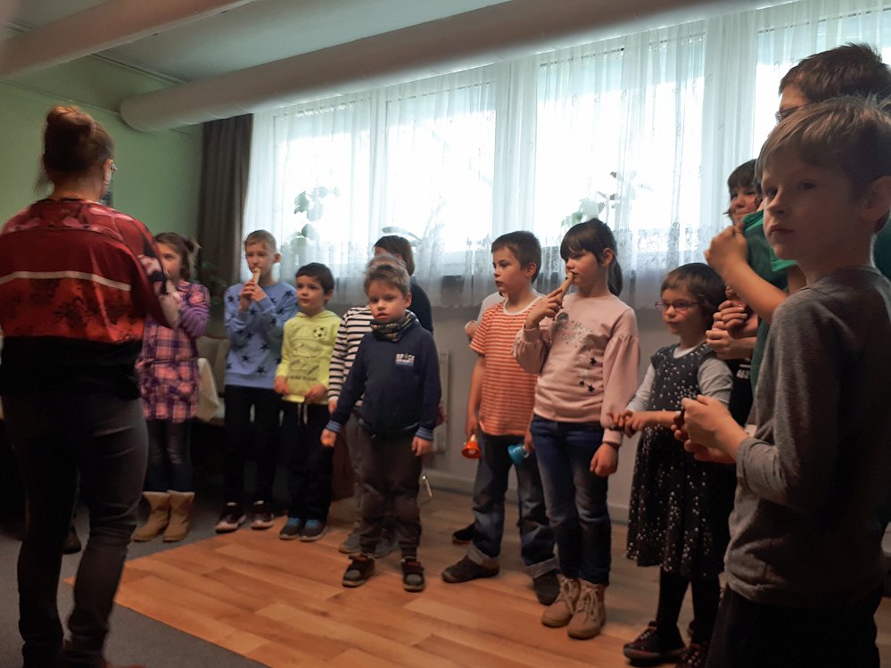 Den Anfang, machten die 1.-4. Klasse und ihre Lehrerinnen, mir den gemeinsamen Gedichten Frühlingssprüchlein und Endlich". Im Anschluss, sangen und tanzten sie, gemeinsam mit Frau Raßbach, zum Lied Immer wieder kommt ein neuer Frühling, mit farbenfrohen Tüchern, sowie zum Lied, Nehmt die Hände in den Stütz, welches sie zusätzlich mit abgestimmten Bewegungen, zu Musik und Gesang gestalteten. Frühlingshafte Vogelstimmen und Klänge hörten wir bei der Kindersinfonie, von Mozart. Die Kinder begleiteten sie aufmerksam und konzentriert, mit Instrumenten, wie Kuckucksflöte, Lotusflöte, Wasserpfeife zum Zwitschern, Glocke, Becken und Triangel.