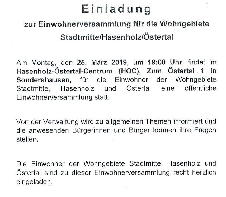 Einwohnerversammlung der Wohngebiete Hasenholz/Östertal/Stadtmitte