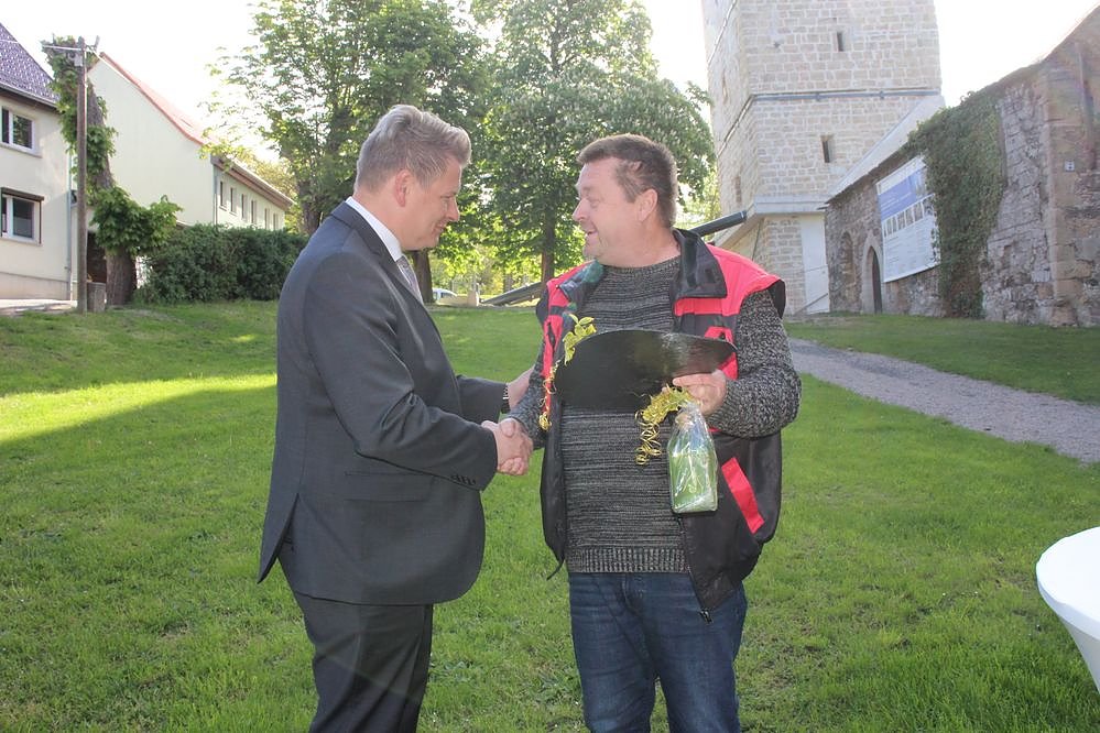 Dank kam von den Bauarbeitern. Von der Dachdecker GmbH Schleiz, übergeben von Steffen Hampel, gab es eine Aufmerksamkeit.