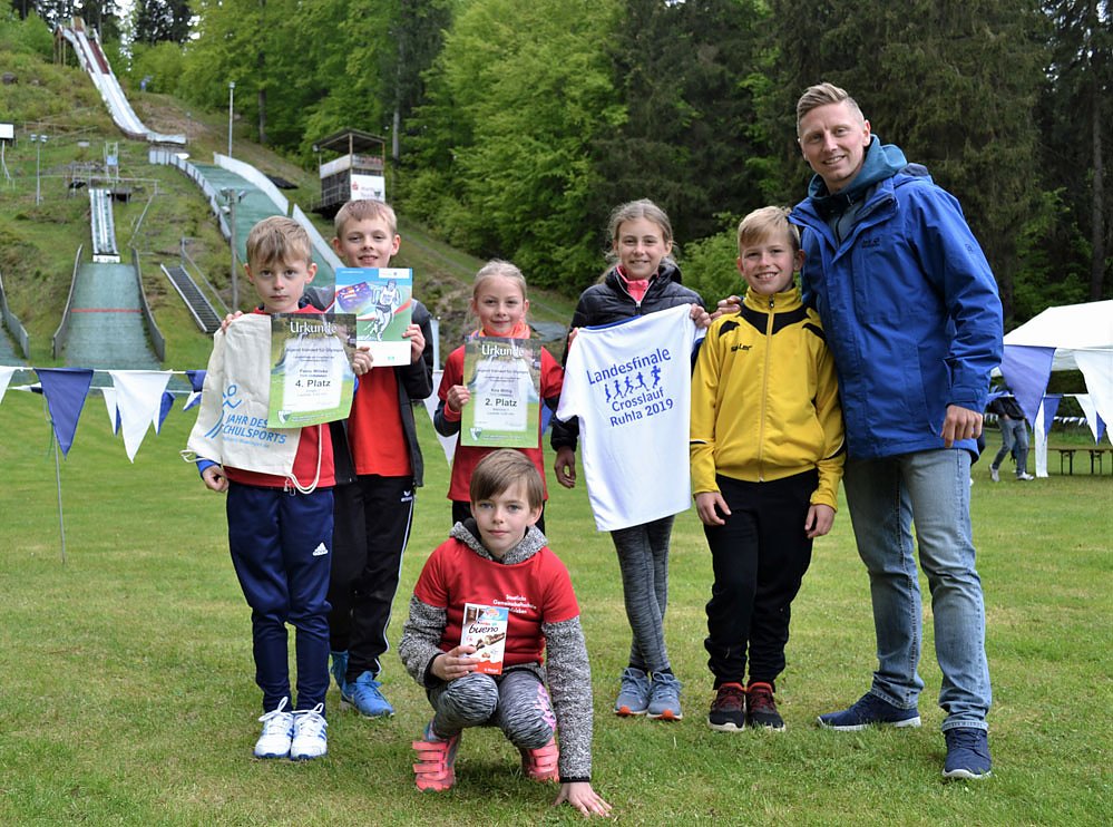 Im Ziel wurden von allen die individuelle Laufzeit ermittelt, sodass sich in der Addition der Einzelzeiten die Mannschaftswertung ergab. Als Pausenfüller zwischen Wettkampfende und Siegerehrung zeigten junge Skispringer*innen der gastgebenden TSG/ Wintersportclub 07 Ruhla e.V. ihr Können von der K40-Schanze. Die Kurstadt Grundschule belegte als Mannschaft Platz 19 von 21, konnte aber mit vier Platzierungen unter den Top 10 dennoch ein gutes Einzelergebnis erzielen.