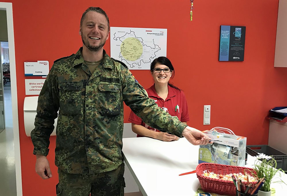 Oberstabsgefreiter Dominic Frank: Ich gehe öfter Blut spenden. Es dient einem guten Zweck. Männer können bis zu sechs, Frauen bis zu vier Mal pro Jahr Blut spenden. Nach dem Blutspenden folgt das Geldspenden.