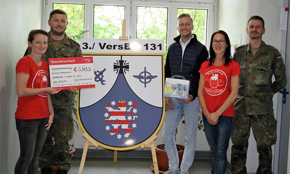 89 Soldatinnen und Soldaten der 3. Kompanie des Versorgungsbataillons 131 haben im Zeitraum 20. bis 22. Mai im HAEMA Blutspendezentrum Blut gespendet. Die Aufwandsentschädigung haben die Soldaten mehr als verdoppelt und dem Kinder- und Jugendhospiz Mitteldeutschland in Tambach-Dietharz insgesamt 3345,32 Euro gespendet.