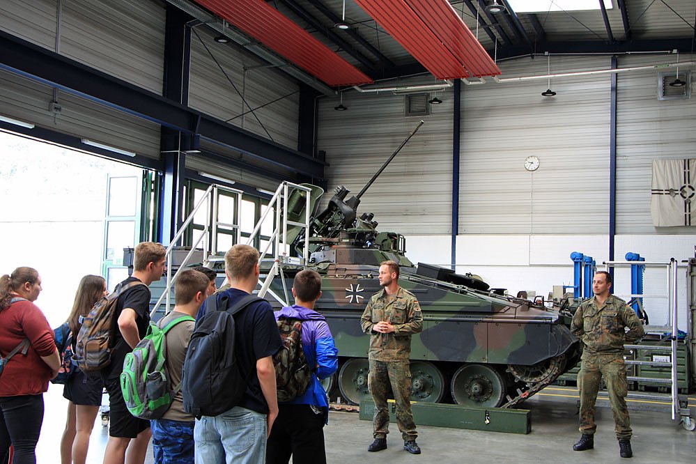Bei über 30°C kam die Abkühlung in den Instandsetzungshallen gelegen. Schatten und kühle Getränke halfen den Schülerinnen und Schülern aufmerksam den Erklärungen der Soldatinnen und Soldaten zu folgen. Hier zeigt Hauptfeldwebel Robert Stein den Schützenpanzer Marder. Ihn unterstütze Stabsunteroffizier Tom Weinert.